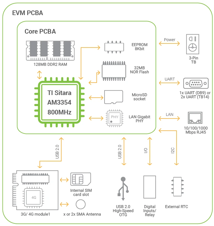 Développez votre application personnalisée en langage C et exécutez-la sur son puissant processeur industriel basse consommation ARM Cortex A8 TI Sitara AM3354 à 800 MHz. Bénéficiez d’une utilisation flexible de vos périphériques, quels que soient vos besoins en stockage, SMS, série, E/S et USB.