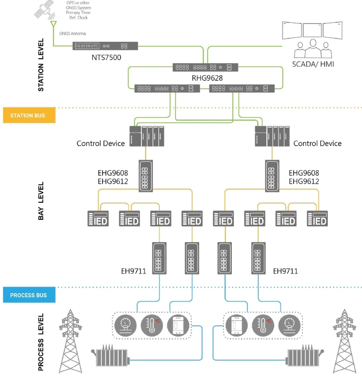 Ce produit joue généralement un rôle important au niveau des travées. Doté de ports Gigabit complets, l’EHG9608 permet de transmettre un volume important de données du niveau processus au niveau supérieur. L’EHG9608 prend également en charge l’horloge transparente de bout en bout assistée par matériel IEEE 1588v2 pour fournir l’heure précise dans les centrales électriques ou les sous-stations.