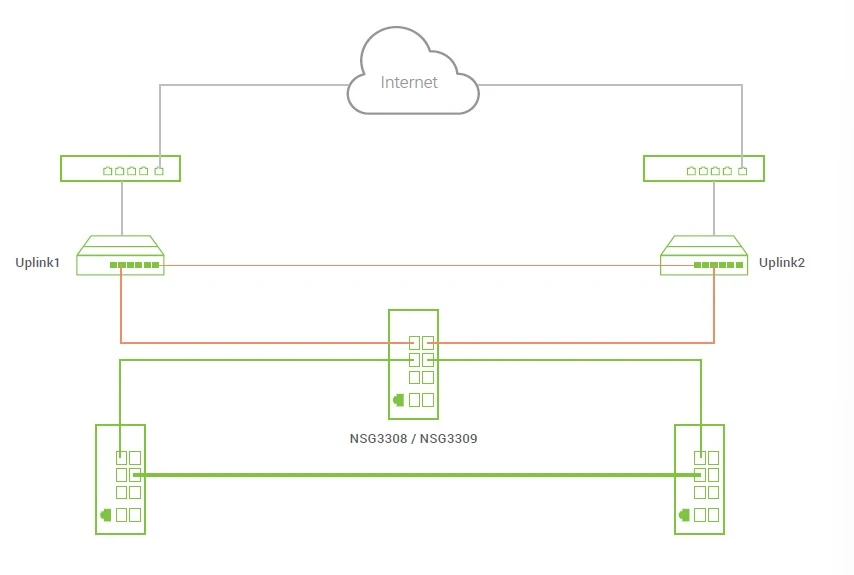 La série NSG3309 est équipée de ports WAN/LAN configurables. Pour la sauvegarde WAN, intégrez le commutateur à un anneau RSTP avec deux ports WAN connectés à deux liaisons montantes différentes. Ainsi, la liaison montante redondante prendra le relais en cas de défaillance du routeur principal. Simultanément, RSTP permet une topologie redondante côté LAN afin de garantir la continuité du réseau.
