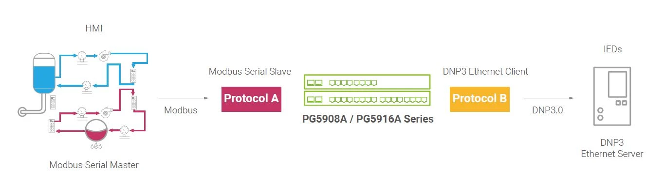 Le Cet exemple montre comment connecter facilement une IHM série Modbus, via la passerelle de protocole ATOP, à un IED serveur Ethernet DNP3.0. L’IHM hôte joue le rôle de maître série Modbus, tandis que le terminal auquel il accède est un serveur Ethernet DNP3.0.