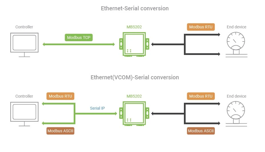 Le MB5202 prend en charge les protocoles Modbus et permet la conversion entre Modbus TCP, Modbus RTU et Modbus ASCII pour toutes les interfaces matérielles prises en charge.