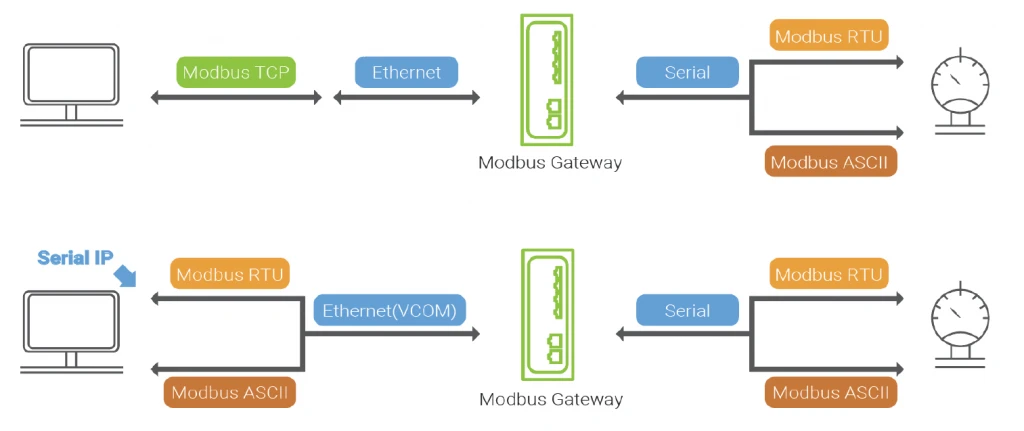 - Conversion Modbus TCP/RTU/ASCII bidirectionnelle de série à Ethernet et vice-versa, prise en charge de VirtualCOM, options Modbus avancées disponibles.