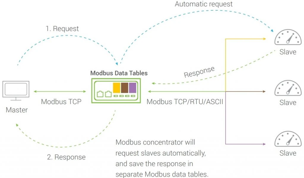 Le concentrateur de données Modbus exécute des commandes Modbus prédéfinies pour lire/écrire les données des appareils esclaves via les ports série. Il reproduit les données des appareils esclaves dans sa propre mémoire. Ainsi, les maîtres demandeurs peuvent recevoir une réponse plus rapidement, ce qui améliore l’efficacité globale.